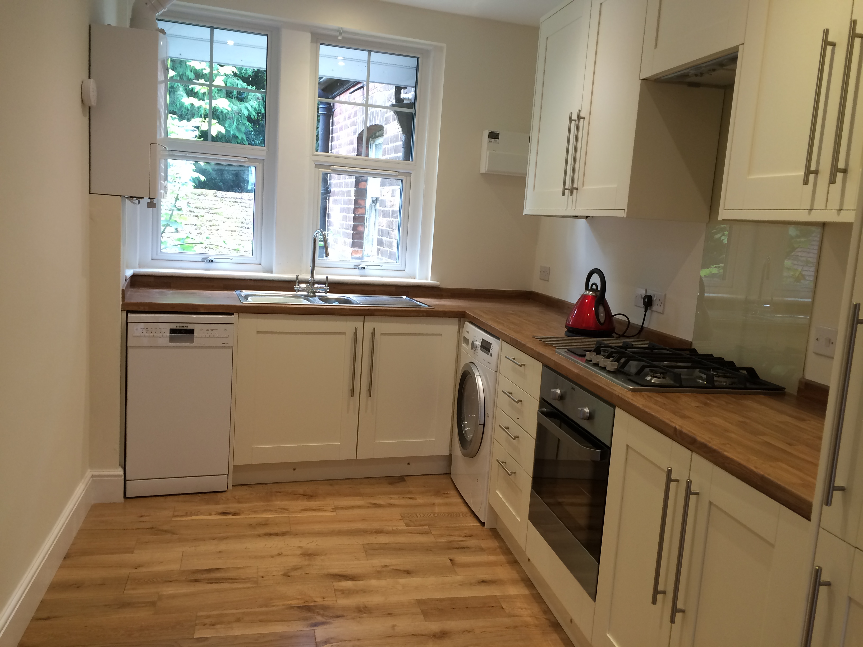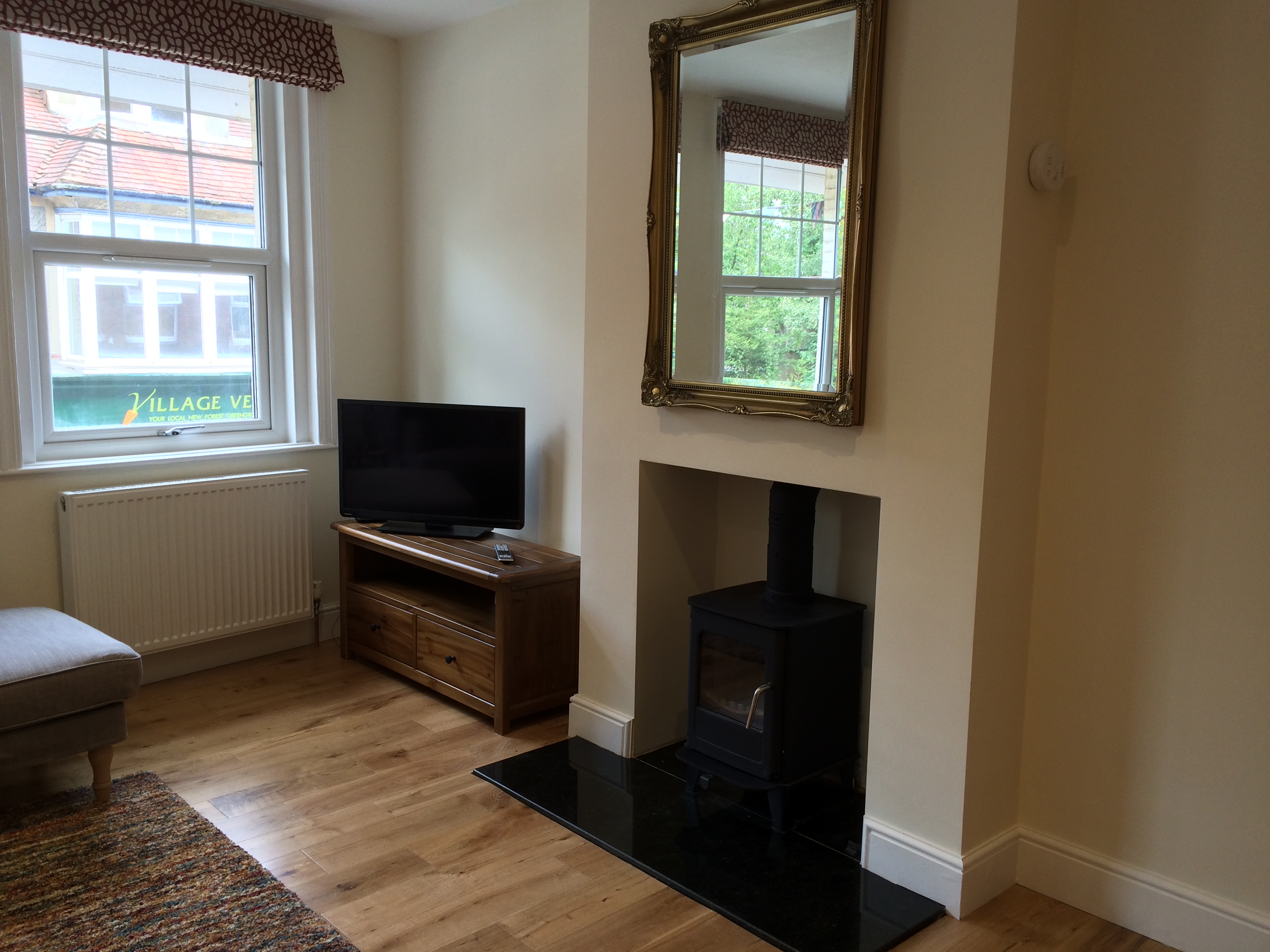 Well equipped modern kitchen with gas hob, fridge with freezer compartment and electric oven. 32 inch flat screen television with Apple TV
